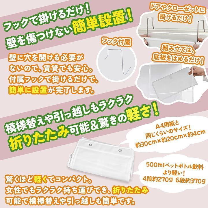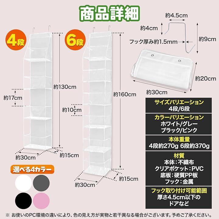 「品名」「ぬいぐるみ収納ケース」「ぬいぐるみストッカー」 「サイズバリエーション」4段/6段 「カラーバリエーション」ホワイト/ピンク/グレー/ブラック 「本体重量」4段270g 6段370g 「材質」収納棚本体:不織布 クリアポケット:PVC 底板:硬質PP板 フック:金属 「フック取り付け可能範囲」:厚さ4.5cm以下のドアなど