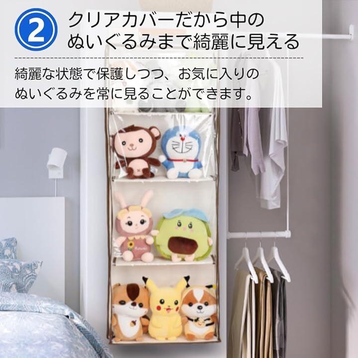 「常に綺麗な状態でぬいぐるみを保管」クリアカバーのため収納したぬいぐるみを常に見ることができるうえ、綺麗な状態を保つことができます。