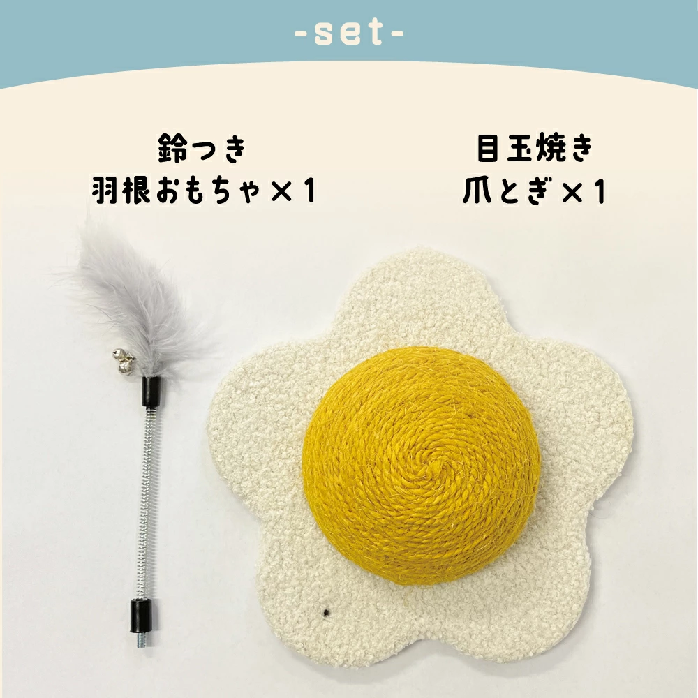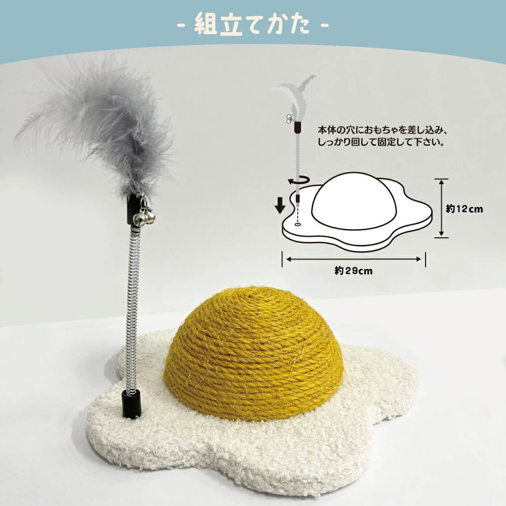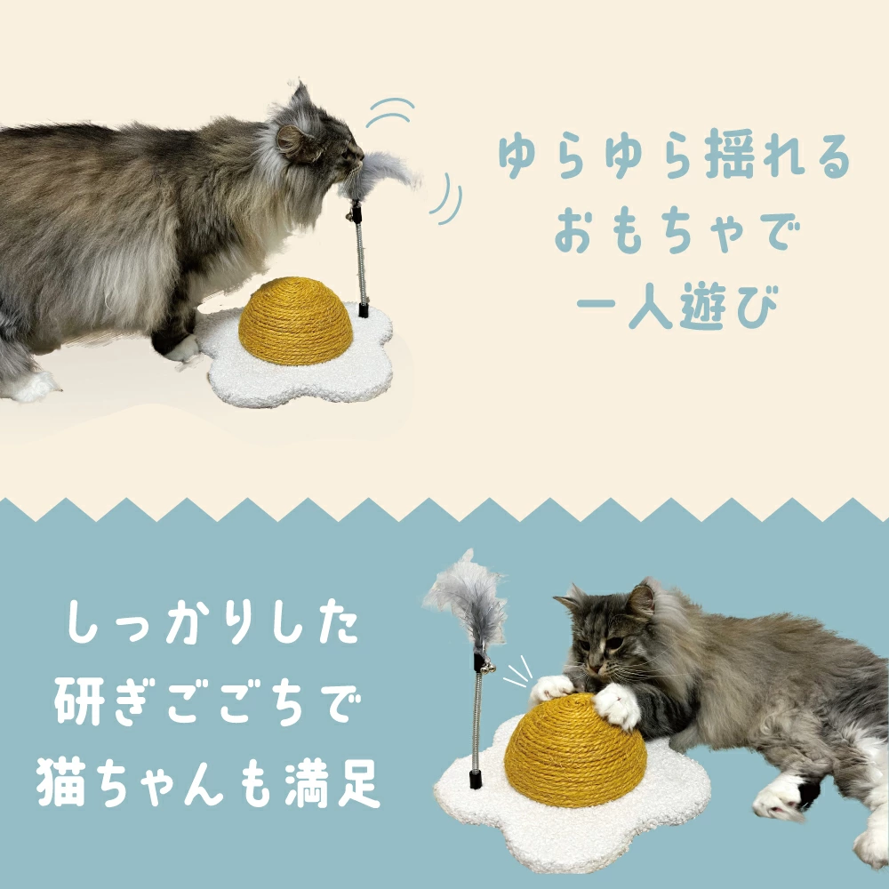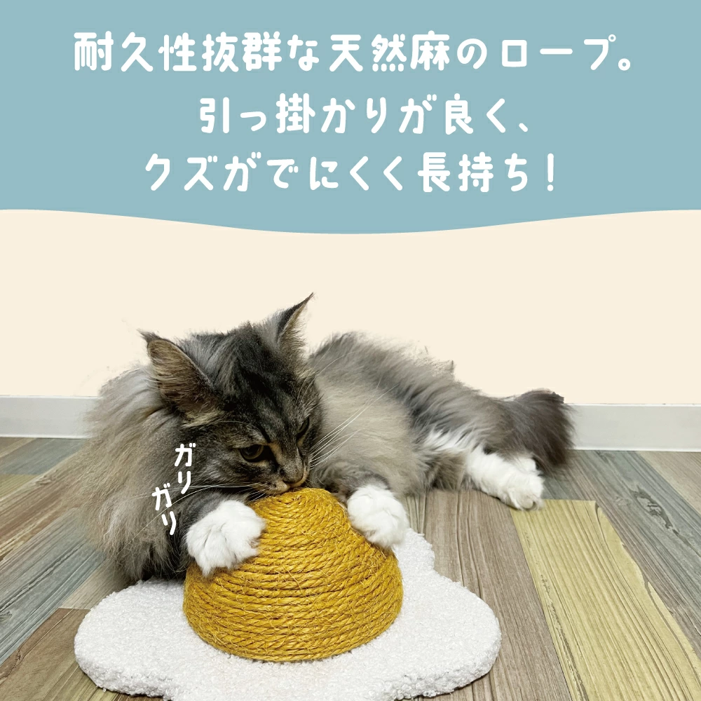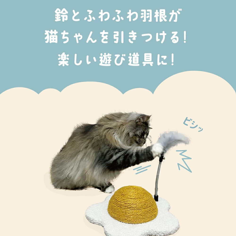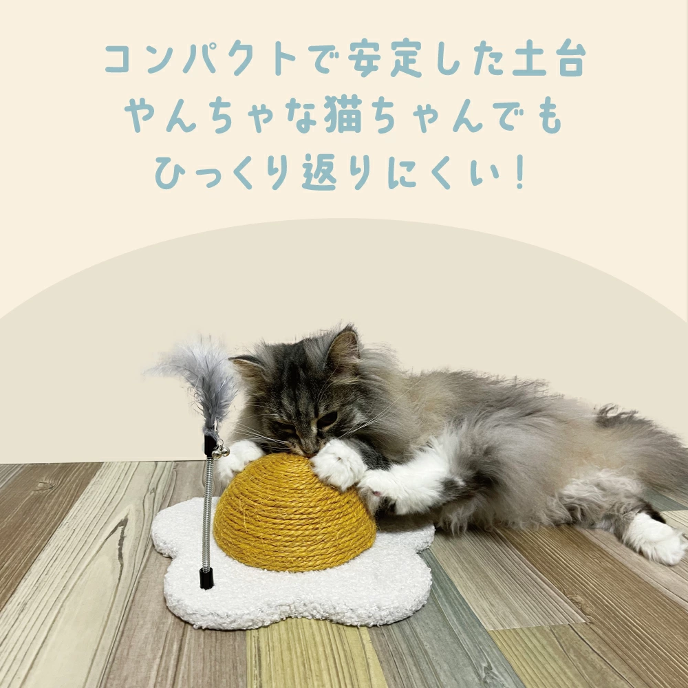 目玉焼きをモチーフにした、かわいい爪とぎです。耐久性がある天然麻のロープ。引っ掛かりが良く、クズが出にくく長持ち。コンパクトで場所をとらない。鈴と羽根のオモチャつき