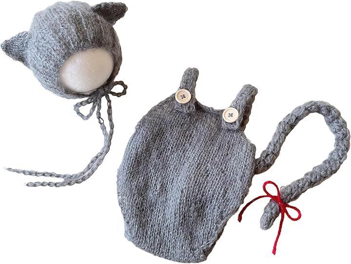 セット内容: 可愛い猫耳付きボンネットと尻尾付きオーバーオールの2点セット、新生児フォト撮影用コスチューム