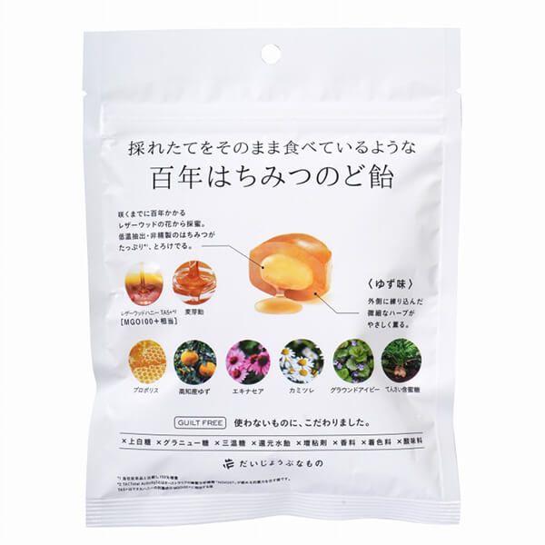 百年はちみつのど飴レザーウッドハニー+ハーブキャンディは咲くまでに百年かかるレザーウッドの花から採蜜したはちみつをたっぷり使用したのど飴です。