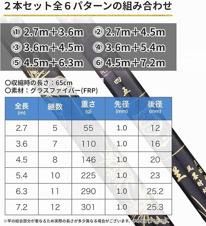 「商品仕様」〇セット内容(全て2本セット):(1)2.7m+3.6m、(2)2.7m+4.5m、(3)3.6m+4.5m、(4)3.6m+5.4m、(5)4.5m+6.3m、(6)4.5m+7.2m。