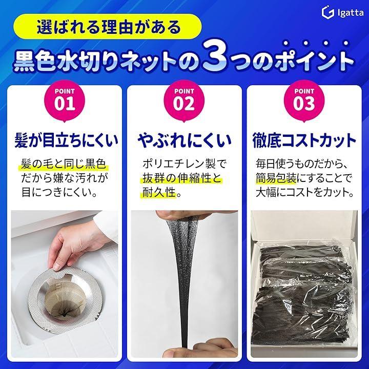 「黒色水切りネットが選ばれる3つのポイント」《髪が目立ちにくい》髪の毛と同じ黒色だから嫌な汚れが目につきにくい。