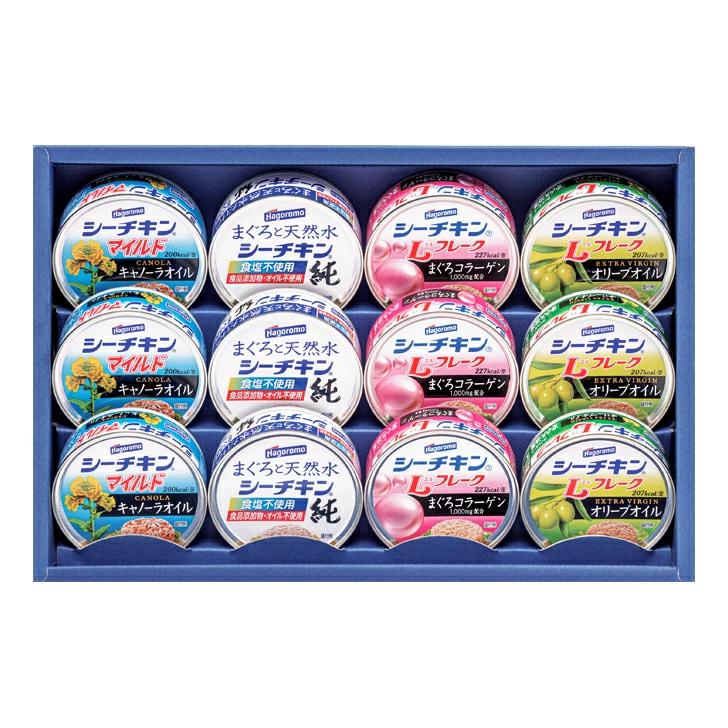シーチキンマイルドキャノーラ、まぐろと天然水だけのシーチキン純、シーチキンLフレークコラーゲン入、シーチキンLフレークオリーブオイル各70g×3