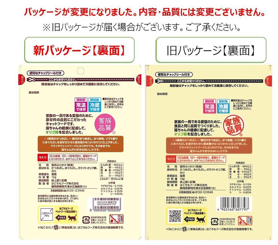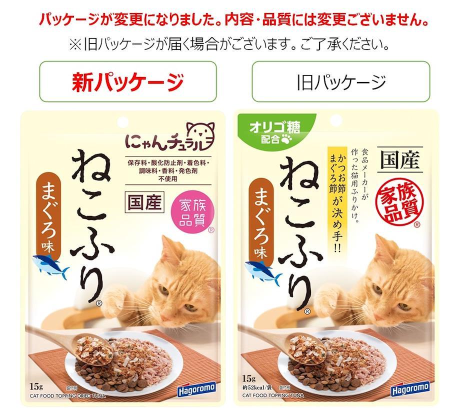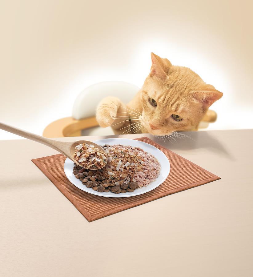 3種のかつおぶし(味付けかつおぶし・かつお粉・ソフト削り)に「まぐろぶし」を混ぜ合わせて風味豊かな「ふりかけ」に仕上げました。ドライフードやウエットフードにふりかけても、そのままでも猫ちゃんが大好きなおいしさです。添加物を一切使用せず仕上げています。猫ちゃんの健康に配慮してオリゴ糖を配合しました。