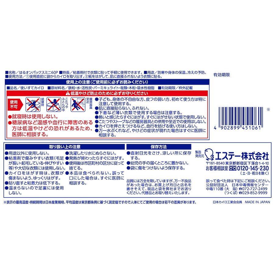 【最後まで安定した温かさ】長時間安定した温度が持続する、貼るタイプのカイロです。【衣類に貼るカイロ】防寒、からだの保温、冷えの予防、屋外でのスポーツ観戦レジャーにお使いください。【からだにぴったりフィット】薄く、中身が均一で片寄りません。【用途】使いすてカイロ 貼るタイプ【スペック】最高温度:63℃ 平均温度:51℃ 持続時間:10時間(40℃以上を保持し、持続する時間)【原産国】日本【内容量】60枚【サイズ】ミニ(9.5cm×7cm)