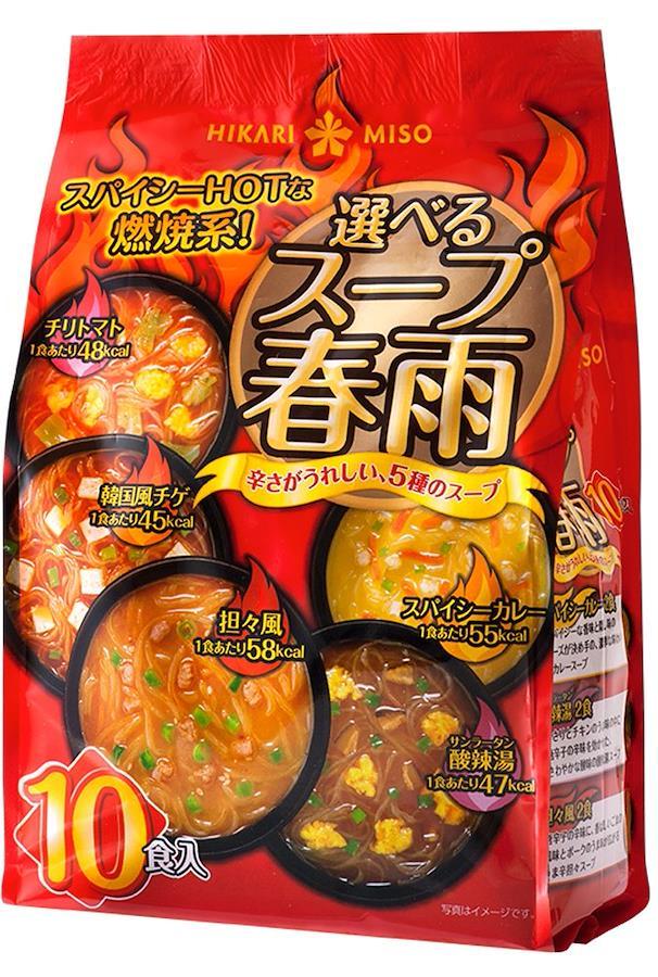 “辛さがうれしい5種類のスープ"はリニューアルにあたって、ファンモニター様にご試食いただき、「おいしい! 」という一言をいただくまで試作を重ねました。ーHOTな5つの味わいー【スパイシーカレー】スパイシーな香味と隠し味のチーズが決め手の、濃厚な味わいのカレースープ【酸辣湯】あさりとチキンのうま味の中に唐辛子の辛味を効かせた、さわやかな酸味の酸辣湯スープ【担々風】唐辛子の辛味に、香ばしいごまの風味とポークのうま味が広がるうま辛担々スープ【チリトマト】トマトの酸味とチキンのうま味で仕上げた、唐辛子が決め手のピリ辛トマトスープ【韓国風チゲ】キムチの風味に魚介とポークのうま味が溶け込んだ、辛さ際立つ韓国風チゲスープ※スープは、1袋に各2食ずつ入っています。