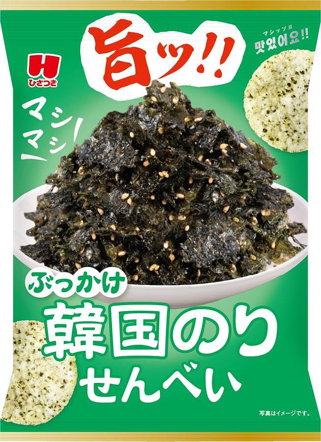 思わず「旨ッ‼」と声が出る、濃厚韓国のりせんべい。国産米100%。生地に韓国のりをふんだんに練り込み、さくっと揚げた後に韓国のりパウダーをふりかけました。濃厚な韓国のりの風味をザクザク食感で味わう揚げ煎餅です。味覚系の「美味しさ」を感じるワードのトレンドの上位の「濃厚」「極うま」「コクのある」といったキーワードをヒントに「濃さ=美味しさ」を訴求したデザイン。従来品と比べ3倍の韓国のりを練り込み圧倒的な韓国のり感を訴求しました。
