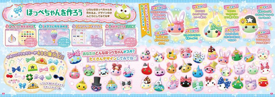 400種類以上のアクセサリーと、20種類以上のもよう、自由自在のカラーで、組み合わせは無限大。自分だけのほっぺちゃんで町をにぎやかに彩ろう。