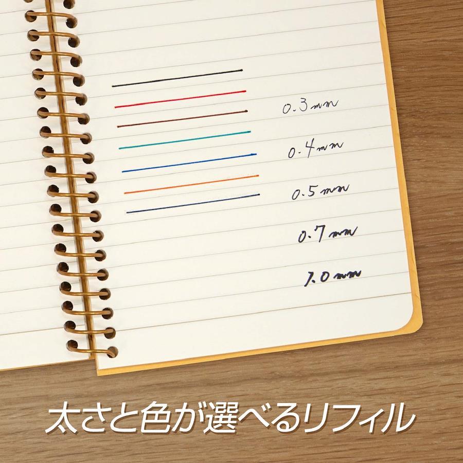 ボールペンの芯径は、0.3mm、0.4mm、0.5mm、0.7mm、1.0mmと幅広く対応しているので、芯を用意すればお好みのサイズで書くことができる。(内蔵芯は、0.5mm)