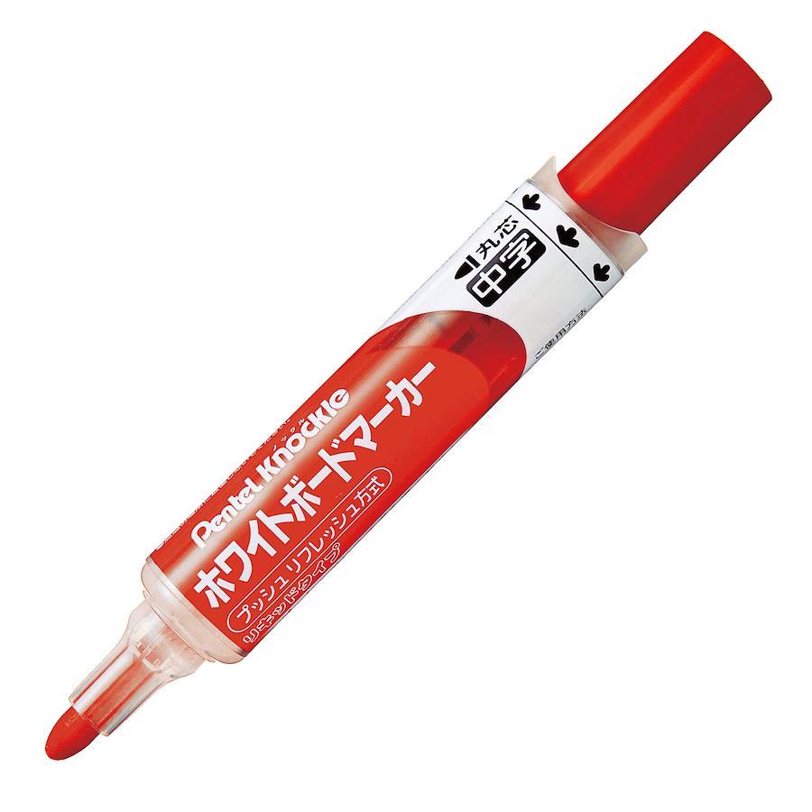 鮮やかなカラーのキャップ式ホワイドボードマーカー。インキが薄くなったら、ペン後ろのノックをプッシュ。インキが出て濃さが戻りまた鮮やかに書ける。