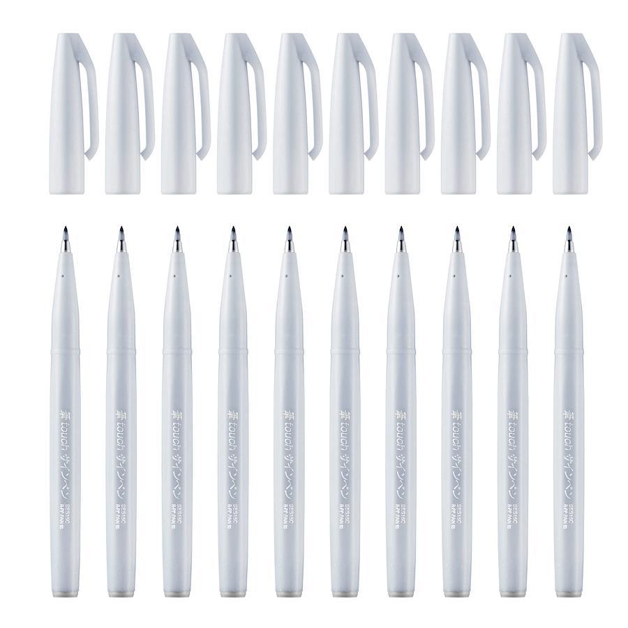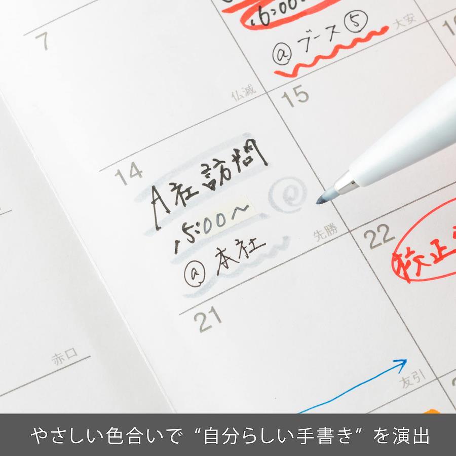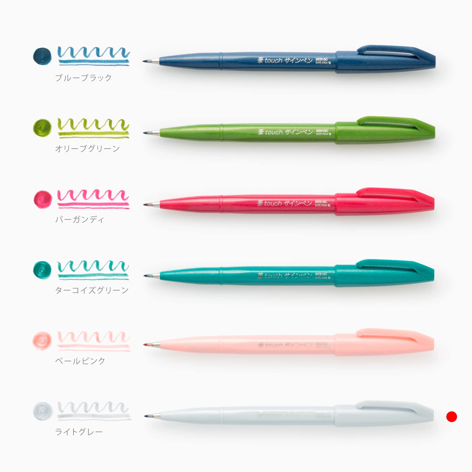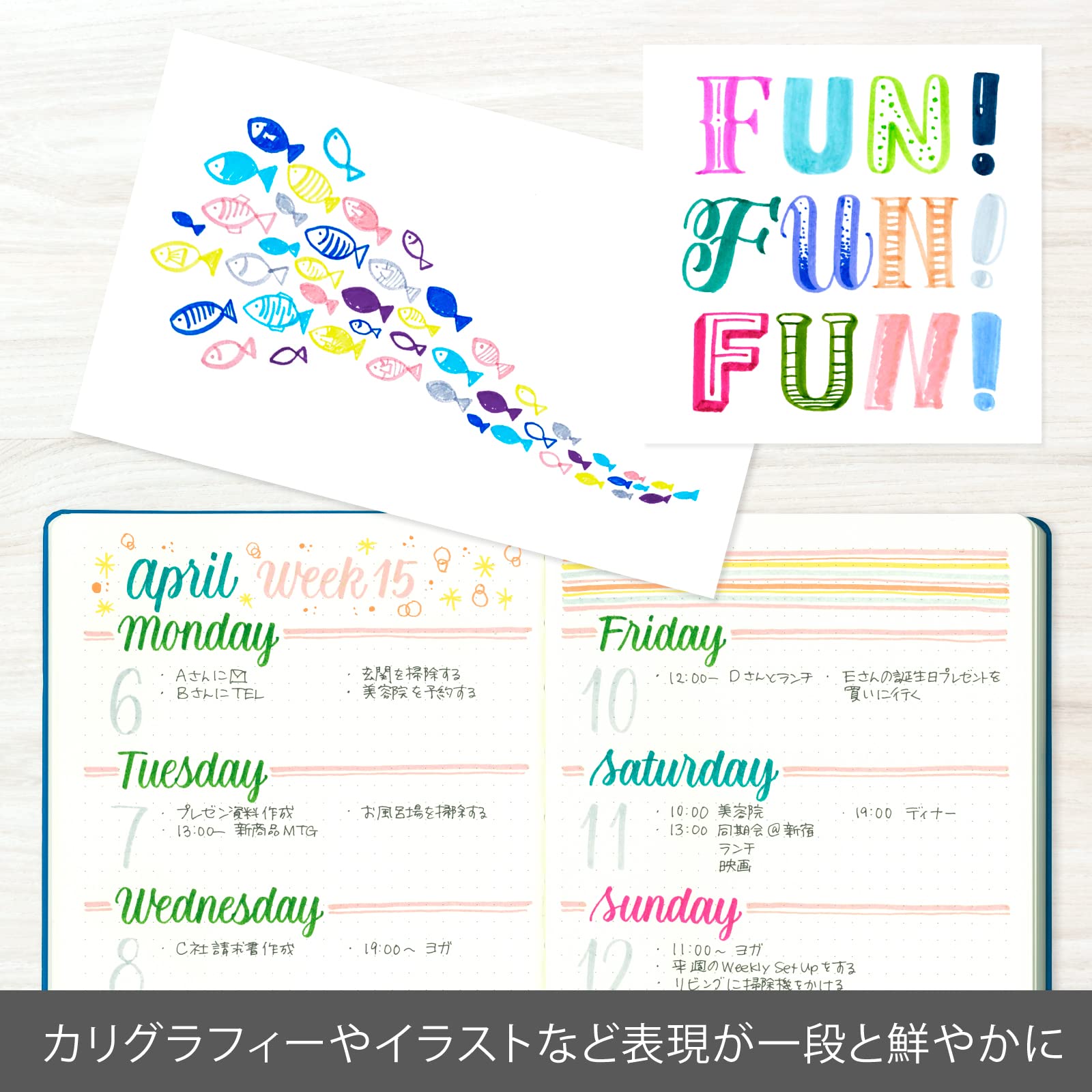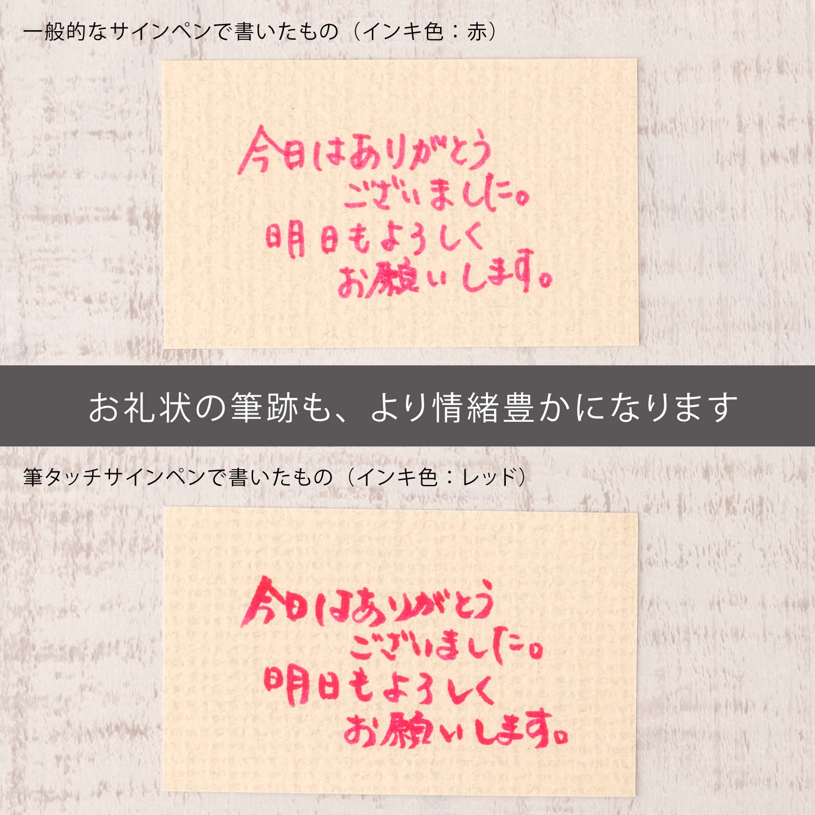 筆のような筆記感が楽しめる「筆タッチサインペン」イラスト、カリグラフィー、メッセージカードなどの用途に便利。鮮やかな発色の水性染料インキ。