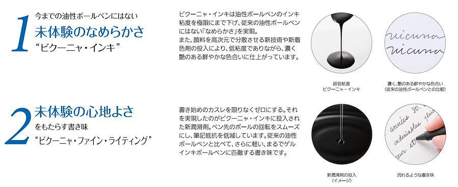 新開発の超低粘度インキ、ビクーニャインキを搭載したなめらか油性ボールペン。黒、赤、青、緑4色の多色ボールペン。ボディデザインは、透明感のあるレイヤードボディが軸全体を包む、スリムでスタイリッシュなライン。グリップ部に握りやすい指紋ピッチを採用。インキに新潤滑剤を使用することでボールの回転がなめらかになり、紙との筆記抵抗値が低減しました。書き初めのカスレも限りなくゼロにし、流れるような書き味を実現しています。