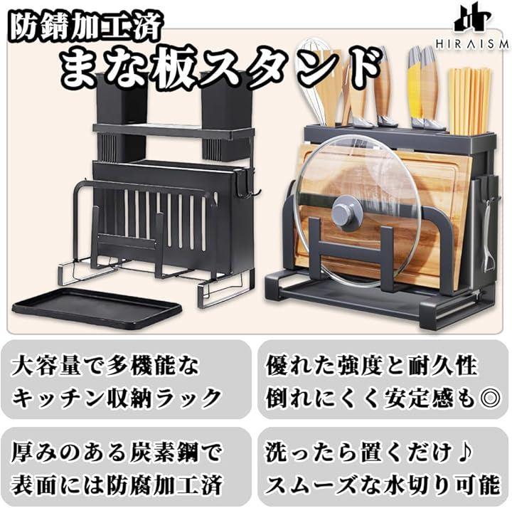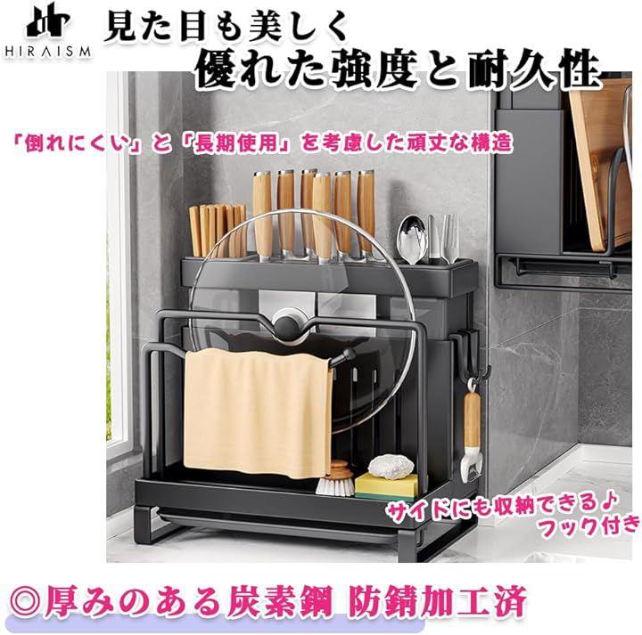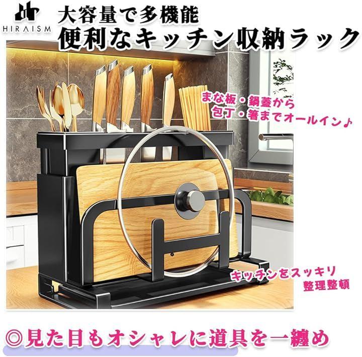 「大容量で多機能。便利なキッチン収納ラック」キッチンが散らかってしまう、収納スペースが狭い、見た目もおしゃれに収納したいなど…そんなお悩みをこれ一つで全て解決。HIRAISMの多機能キッチン収納ラックは、まな板、包丁、箸、鍋蓋、カトラリーなどをひとまとめにし、キッチンをスッキリ整理整頓できます。