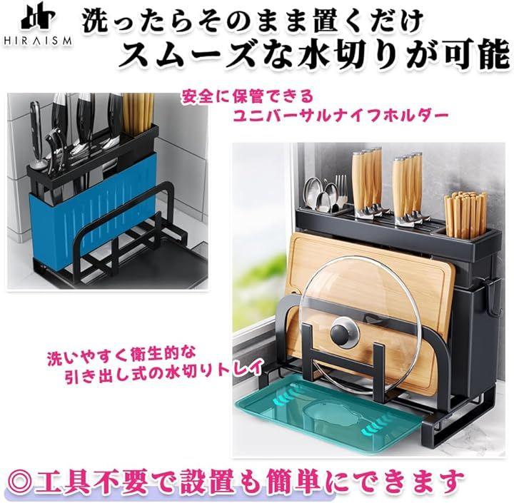 「カンタン水切り」引き出し式の水切りトレイと、さまざまなサイズの包丁・ナイフを安全に保管できるユニバーサルナイフホルダーを完備。