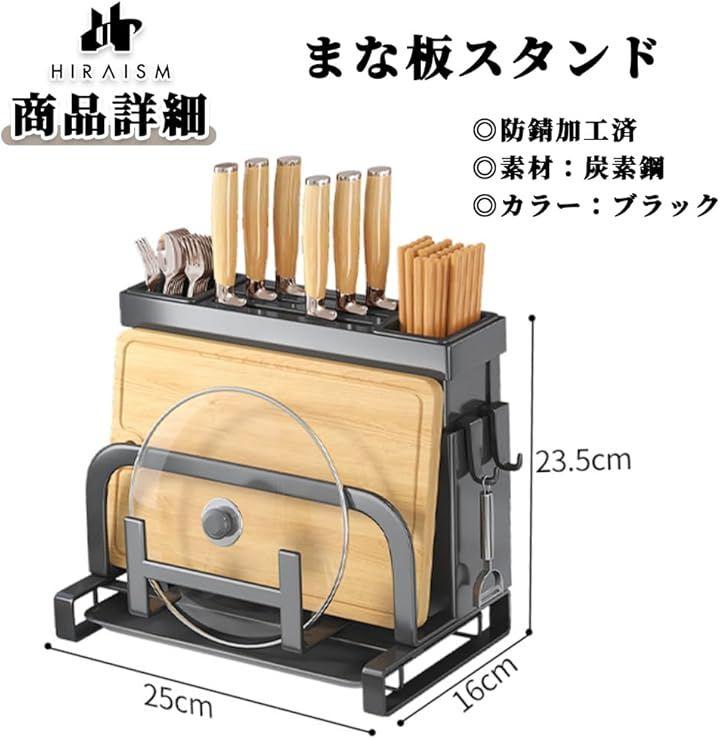 「商品内容」まな板スタンド 素材:炭素鋼 カラー:黒 サイズ:幅25cm 奥行16cm 高さ:23.5cm 備考:防錆加工