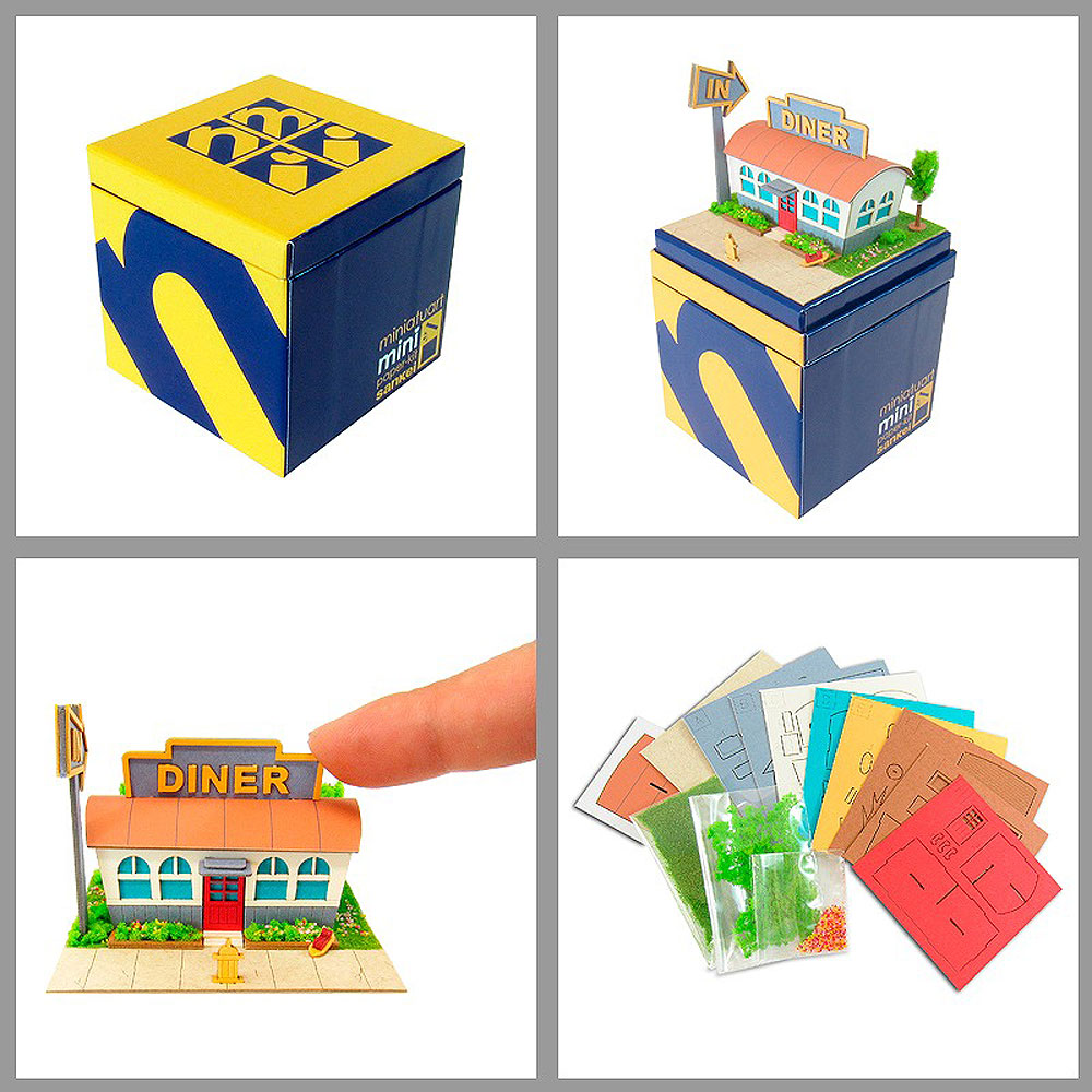 みにちゅあーとmini 【アメリカンダイナー】セット内容:レーザーシートA〜H(8枚)ベース(1枚)屋根シート(1枚)庭セット(緑粉末、スポンジ、色砂)組み立て説明書サイズ:パッケージW60×D60×H60(107)mm本体W54×D54×H41mm※内は本体を乗せた時の寸法です対象年齢:12才以上組み立て所要時間:約2時間〜企画:オモロデザイン・株式会社さんけい