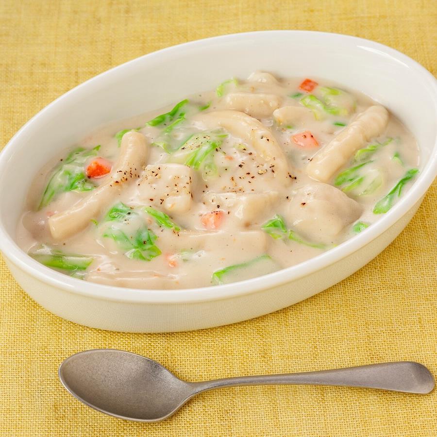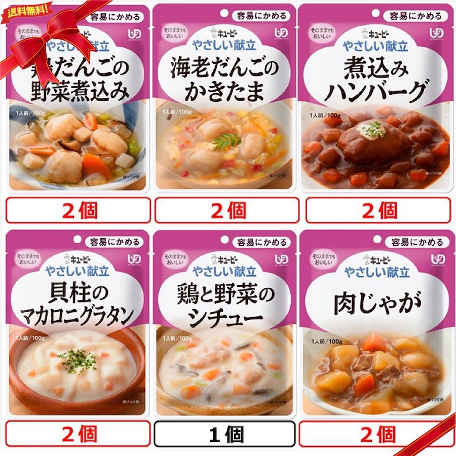 具材の形を残し、スプーンなどでかんたんにつぶせるくらい柔らかく調理した介護食(ユニバーサルデザインフード)です。「鶏だんごの野菜煮込み」「海老だんごのかきたま」「煮込みハンバーグ」「貝柱のマカロニグラタン」「肉じゃが」が2袋ずつ、「鶏と野菜のシチュー」が1袋入ったアソートセットです。