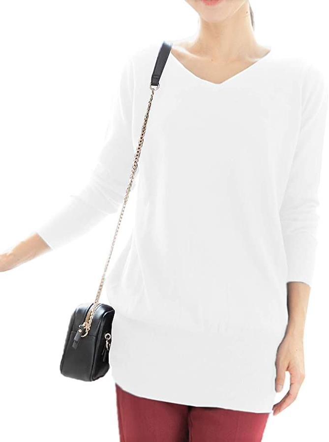 ・無地で程よく開いたVネックニットにはネックレスやブレスレットも映えます・きれいめ秋色カラーとちょっと長めのセミロング丈が、体型カバーしながら女性らしいスタイリングを1ランクUPし、秋冬コーデも簡単に。