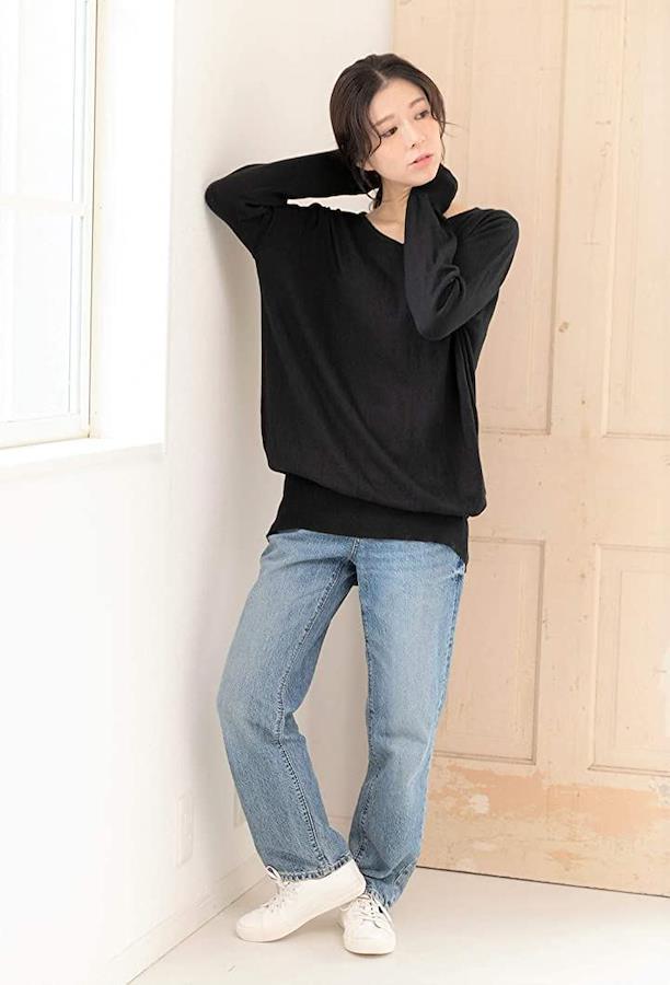 Vネックと、裾ワイドリブですっきりスタイルアップして見せます。
