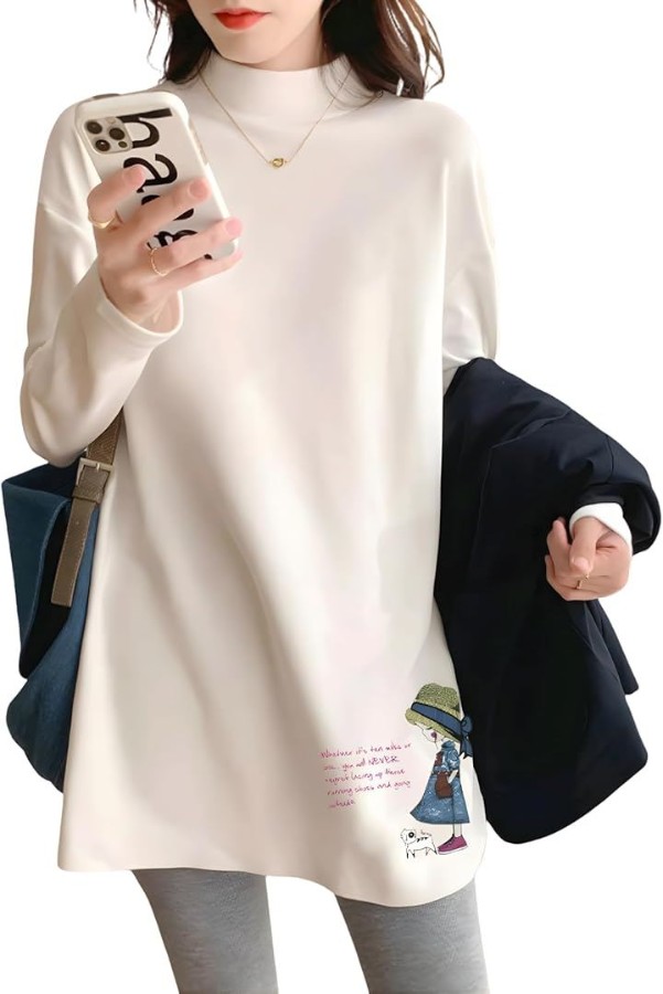 [ [ブブ オーハナ] ゆったり 長袖 ロング Tシャツ チュニック ハイネック 背面無地 裏起毛 肌触りサラサラで心地よい着心地 レディース ]