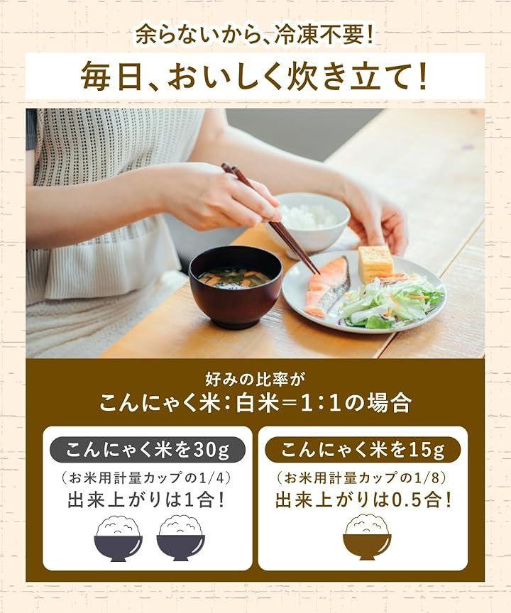 こんにゃく米:白米=1:1の場合、こんにゃく米を30g(お米用計量カップの1/4)にすると、出来上がりは1合です。