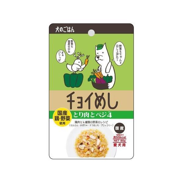 ●チョイの国産レトルトシリーズ。国産鶏肉と4種類の国産野菜(にんじん、かぼちゃ、さつまいも、ブロッコリー)のレシピです。野菜好きで、ヘルシー嗜好のワンちゃんに。