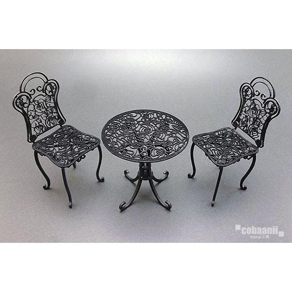 アイアンテーブル&チェアー(薔薇デザイン) Iron Table and Chairsレーザーカットされた紙製の組み立てキットです。寸法:テーブル W60 D60 H62 mmイス W38.5 D50 H98.5 mm入り数:テーブル1台/椅子2脚材質:特殊厚紙