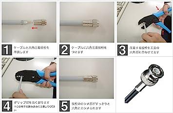全長:240mm; 重量:600g用途:同軸圧着工具 F型プラグ専用対応端子:①同軸コネクター(RG58/3D-2V(50Ω系) RG59/3C-2V(75Ω系)、RG6/5D-2V(BNC、F型)、"RG213/8D-2V(50Ω系) RG11/7C-2V(75Ω系))ダイスHEXサイズ:5.4 / 8.2 / 11 mm特徴:クリンプハイト調節ダイヤル、ラチェット緊急解除