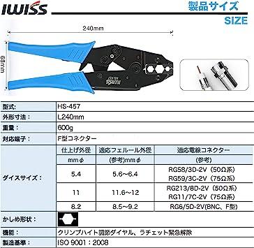 通常1-5営業日で発送:アイウィス(IWISS) 同軸 F型コネクタ 7C 5C 3C 圧着工具 ラチェット式 HS-457