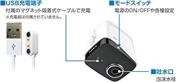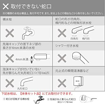 サイズ:約幅4.1×奥行5.3×高さ6cm、本体重量:約115gセット内容・付属品:本体・ストレーナパッキン付きアダプター (4タイプ)・USB充電ケーブル・専用スパナ・取扱説明書、使用場所:0~40度環境の屋内(浴室内または火気の近くを除く)使用電源:内蔵電池(リチウムイオン電池)、充電目安:1日200回使用で約8ヶ月(フル充電時)センサー:反射式赤外線センサー、自動センサー:手を差し出している間だけ吐水、側面センサー:手動にすると水を出し続ける事が可能オートストップ時間:約180秒、センサー感知距離:約10~18cm (出荷時は15cm)