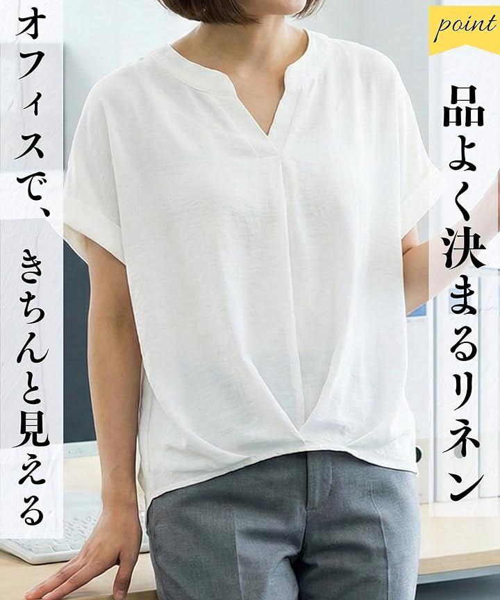 綿麻混で涼しく二の腕カバー 柔らかい綿麻混の薄手素材を使用し、通気性は抜群。