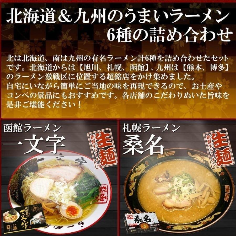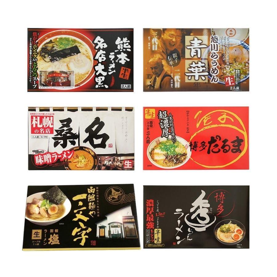?北は北海道、南は九州の有名ラーメン計6種を詰め合わせたセットです。毎日行列ができるご当地ラーメン屋の店主監修のもと、ご自宅でも簡単に作れるラーメンが誕生しました。名店ラーメンの詰め合わせセットです。常温保存商品で、保存管理が簡単です。【セット内容:各1箱(2食入り)】旭川ラーメン青葉(■ちぢれ細麺 ■醤油スープ) / 札幌ラーメン桑名(■ちぢれ中細麺 ■味噌スープ) / 函館ラーメン一文字(■ウェーブ細麺 ■塩スープ) / 熊本ラーメン大黒(■ストレート細麺 ■豚骨スープ) / 博多ラーメン秀ちゃん(■ストレート細麺 ■濃厚とんこつスープ) / 博多ラーメンだるま( ■極細麺 ■背油たっぷりとんこつスープ)自宅に居ながら簡単にご当地の味を再演でき、お土産やコンペの景品などにもおすすめです。各店舗のこだわりぬかれた旨味を是非ご堪能ください。北海道からは【旭川、札幌、函館】、九州は【熊本、博多】のラーメン激戦区に位置する超名店をかけ集めました。【セット内容:各1箱(2食入り)】旭川ラーメン青葉/札幌ラーメン桑名/函館ラーメン一文字/熊本ラーメン大黒/博多ラーメン秀ちゃん/博多ラーメンだるまお中元、お歳暮、お年賀、誕生日のギフトとしても。【重要】メーカーによる商品リニューアルに伴いパッケージ(内容量も含む)変更が行われた場合、新パッケージでお届け致します事ご了承願います。