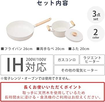 通常1-5営業日で発送:セット内容:フライパン 26cm/無加水なべ ふた 20cm、両手なべ20cm対応熱源:IH200V、IH100V、ガスコンロ、ラジエントヒーター。電子レンジ、オーブンでは使用できません。【フライパン 26cm】表面加工:内側/セラミック塗装加工、外側/焼付塗装加工。材料の種類:本体/アルミニウム合金、はり底/ステンレス鋼(クロム16%)、底の厚さ/4.5mm(はり底含む)、ハンドル/天然木(ぶな)。寸法:26cm。満水容量:3.2L【両手なべ 20cm】表面加工:内側/セラミック塗装加工、外側/焼付塗装加工。材料の種類:本体/アルミニウム合金、はり底/ステンレス鋼(クロム16%)、底の厚さ/4.5mm(はり底含む)、ハンドル/天然木(ぶな)。寸法:20cm。満水容量:2.8L【ふた 20cm】表面加工:内側/セラミック塗装加工、外側/焼付塗装加工。材料の種類:本体/アルミニウム合金、つまみ/天然木(ぶな)