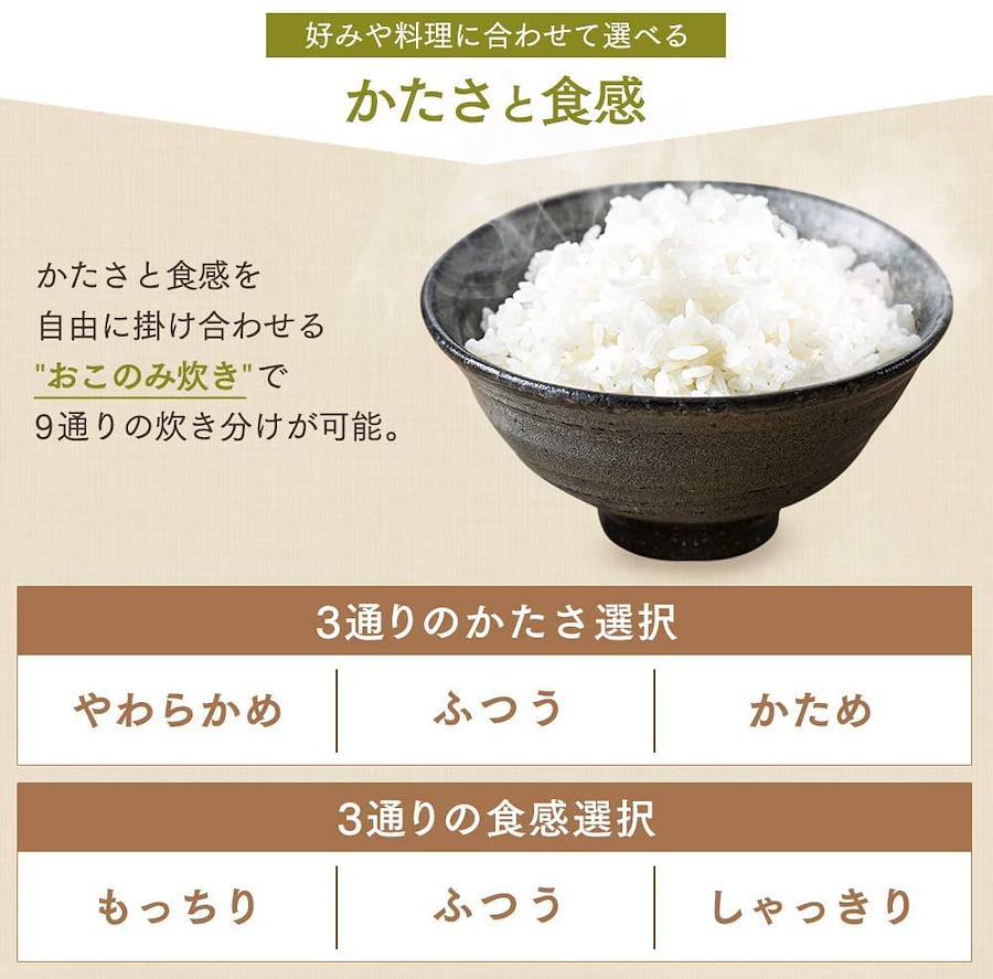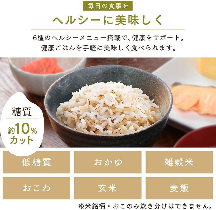 3営業日以内に発送≪新品未開封品≫:電源:ac100v(50/60hz共用)定格消費電力(炊飯時):645w炊飯容量(最大):無洗米、白米、新米、早炊き、省エネ:1.0l(5.5合)/玄米、麦飯、雑穀米、おこわ、炊込み:0.54l(3合)/低糖質:0.45l(2.5合)/おかゆ:全がゆ0.27l(1.5合)、5ぶがゆ0.09l(0.5合)電源コードの長さ:約1.0m1回あたりの炊飯時消費電力量:152.5wh ※1 ※商品の仕様は予告なく変更することがあります。※実際に使用するときの消費電力量は、米の量・炊飯のメニュー・周囲の温度などによって変わります。※1 家庭用品品質表示法にもとづく「電気ジャー炊飯器」の省エネ法関連表示です。蒸発水量は、1回あたりの炊飯時に炊飯器の外に放出した水の質量で、省エネ法の目標基準値を算出するために用いる数値です。白米の省エネメニューで計測。※お買い上げ時は省エネメニューに設定されています。お好みに応じて炊飯メニューを選んでください。