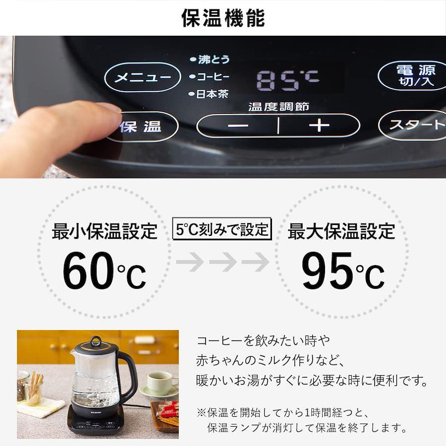 ●商品サイズ(cm)/電源プレート含む:幅約21.7×奥行約22.2×高さ約27.5/電源プレート含まず:幅約20.5×奥行約15.5×高さ約24.5●質量/電源プレート含む:約1.7kg/電源プレート含まず:約1.0kg●湯沸かし容量:約1.5L●電源コード長さ:約1.2m●湯沸かし温度: 60℃~100℃の間で5℃刻みで設定可能●保温温度: 60℃~95℃
