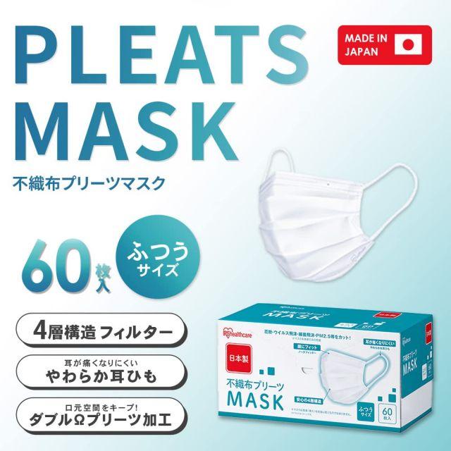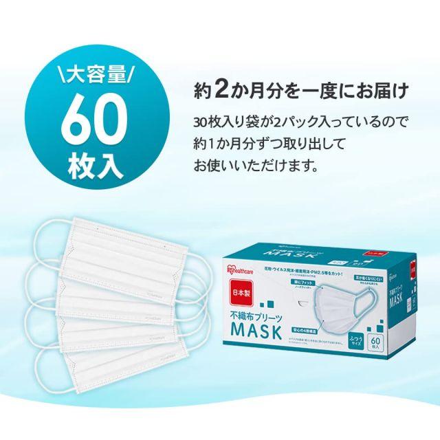 サイズ:ふつうサイズ(60個)◆商品名:アイリスオーヤマ(IRISOHYAMA)日本製不織布プリーツふつうサイズ60枚入やわらか耳が痛くならないPN-NC60Lホワイト白業務用