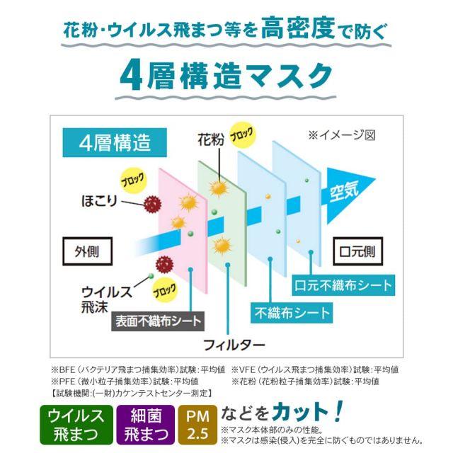 日本製、4層構造マスク。◆花粉・ウイルス飛沫等を4層構造で防ぐウイルス飛沫、細菌飛沫、PM2.5などをカット!◆大容量60枚入り約2カ月分を一度にお届け。30枚入り袋が2パック入っているので、約1か月分ずつ取り出してお使いいただけます。◆安心・安全の日本製マスク日本のマスクで、安心と快適をお届けしたいその想いから生まれた、高品質な日本製マスクです。◆1日中つけていても快適・ノーズフィッター高密着で隙間を軽減し、花粉やほこりの侵入をガード。・Ωプリーツ加工口元に空間ができ、呼吸がしやすいΩプリーツ加工。・やわらか耳ひも長時間付けても耳が痛くなりにくい幅約4mmの耳ひも。