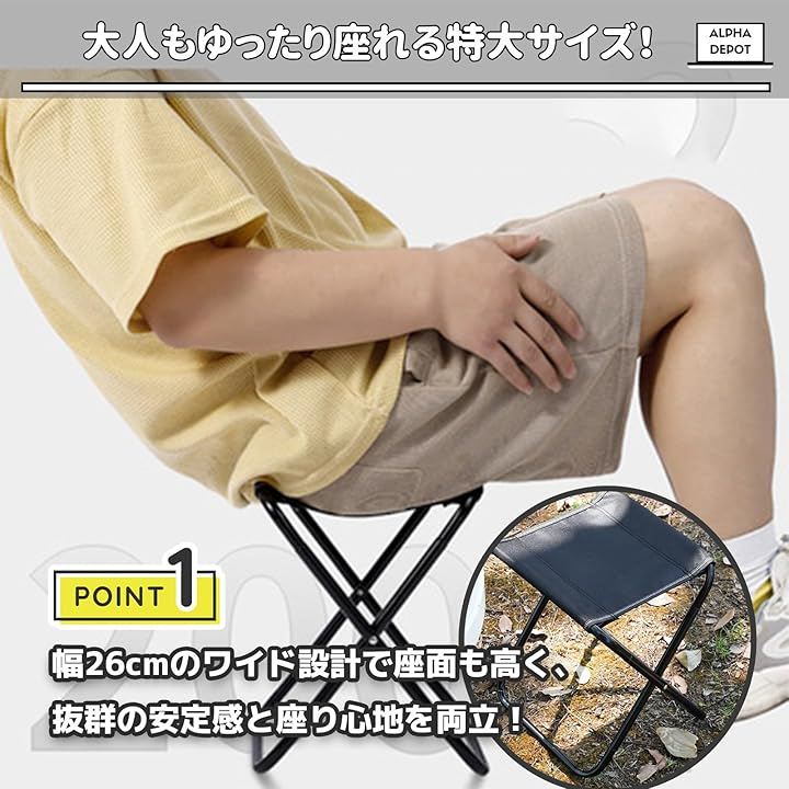 「アウトドアでも快適な座り心地。」特大サイズの折りたたみ椅子で、屋外でもしっかり安定して座れるから長時間でも快適。