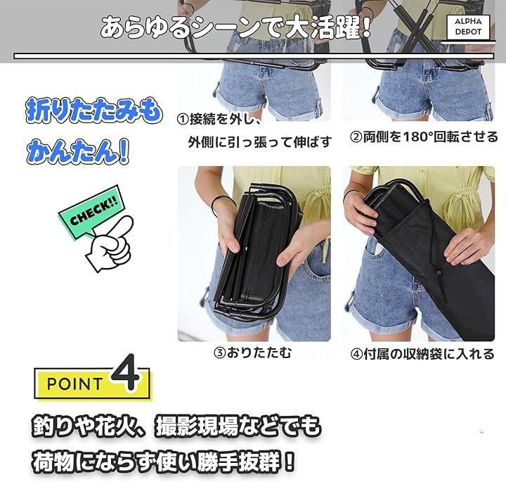 「釣りやイベントにもぴったり。」軽量なのに丈夫で、キャンプやピクニック、登山や撮影現場などにも気軽に持ち出せる。