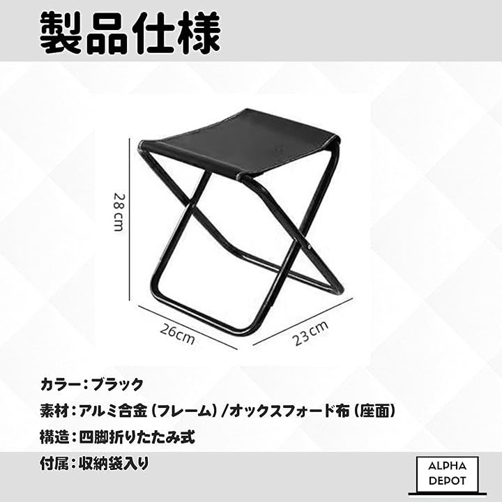 「製品仕様」サイズ(使用時):約26cmx23cmx高さ28cm/耐荷重:100kg/カラー:ブラック/素材:アルミ合金(フレーム)、オックスフォード布(座面)/構造:四脚折りたたみ式/付属:収納袋入り*本製品は取扱説明書が付属しておりませんので、あらかじめご了承ください。