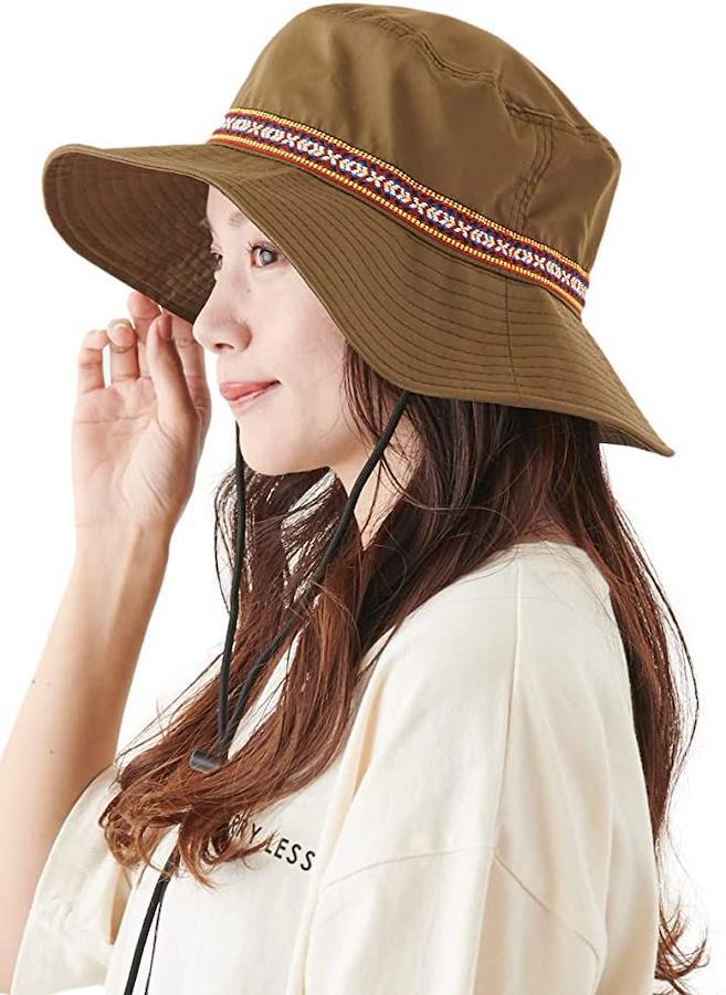 ・*UVカット、撥水加工、あご紐つき、サイズ調整可能、機能が盛りだくさんのアウトドアハットです(^^)かわいいチロリアンテープがワンポイントアクセント。