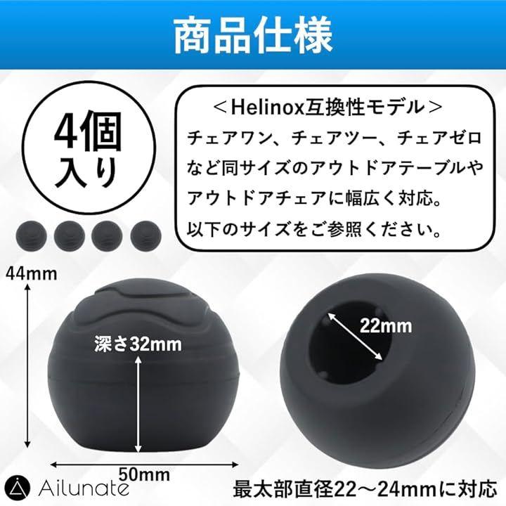 「商品仕様」内容量:4個入り、ヘリノックス互換性モデルでチェアワン、チェアツー、チェアゼロなど同サイズのアウトドアテーブルやアウトドアチェアに幅広く対応した汎用モデルです。