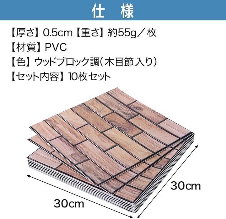 「サイズ」約 縦 30cm x 横 30cm x 厚さ 0.5cm「重さ」約55g/枚「材質」PVC「色」ウッドブロック調(木目節入り)「セット内容」10枚セット