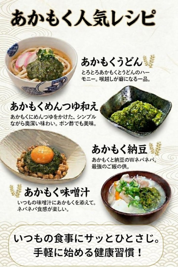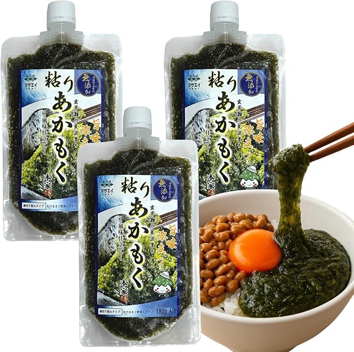 名称:湯通しあかもく原材料:あかもく原材料産地:福岡県玄界灘産内容量:180g賞味期限:パッケージに記載保存方法:要冷凍(-18℃以下)(解凍後冷蔵保存で7日以内にお召し上がりください(未開封))製造者:株式会社マサエイ水産加工福岡県宗像市鐘崎230-4栄養成分表示:100gあたり熱量:11kcal、たんぱく質0.9g、脂質:0.3g、炭水化物4.1g、食塩相当量0.3g(推定値)