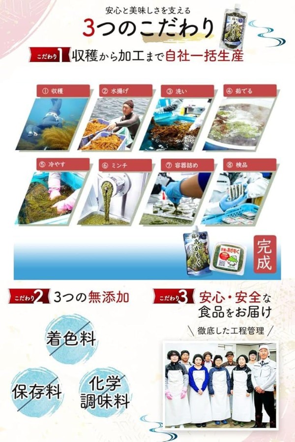 「無添加・安心」保存料・着色料不使用、自然由来のアカモクでフコイダン・フコキサンチン・食物繊維・カリウム・鉄など豊富に含有しています