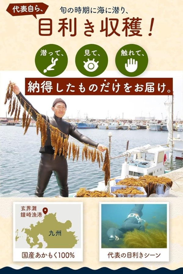 「国産アカモク100%」福岡県玄界灘・鐘崎漁港産のあかもくを、代表自らが旬の時期に目利きして厳選した逸品です