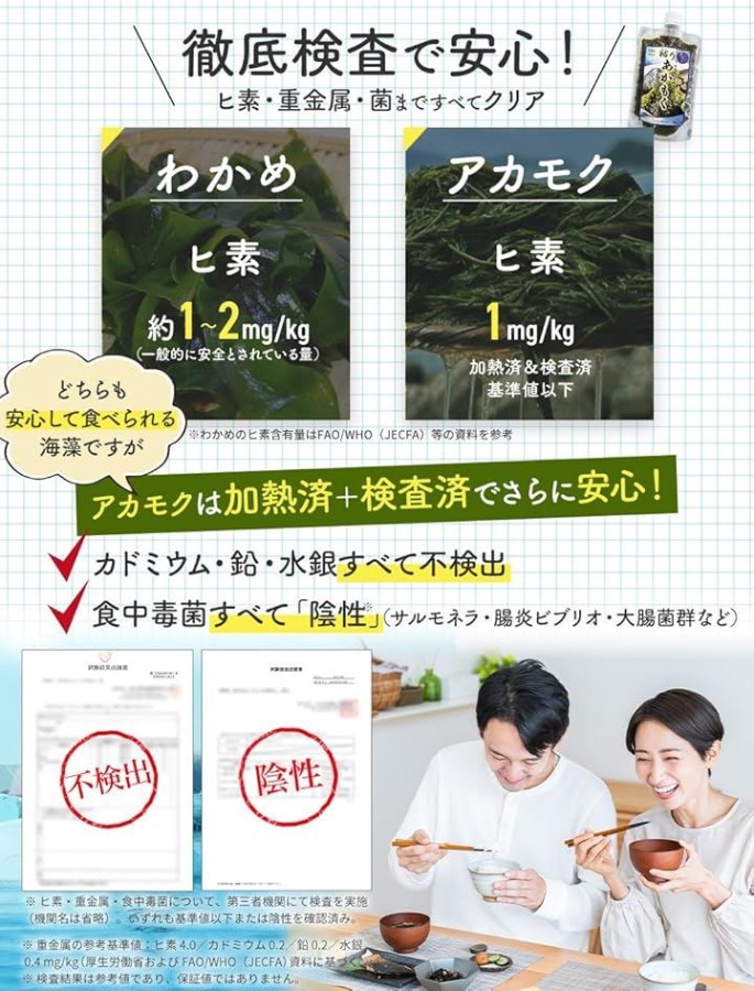 「安全検査済みのアカモク」ヒ素・重金属・食中毒菌検査をクリアした安心品質のアカモクをお届けします