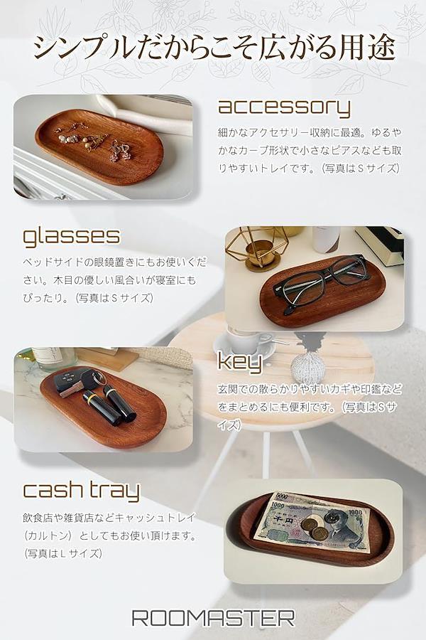 「様々な用途でお使いください」アクセサリー収納のほか、玄関での小物収納・鍵置き、寝室でのメガネ置き、デスク回りでの小物収納やペントレイ、店舗でのキャッシュトレイ(カルトン)など様々なシーンでご使用頂ける多機能の木製トレイです。