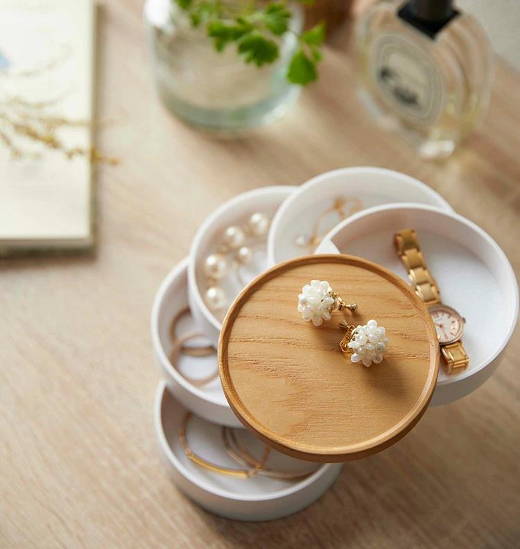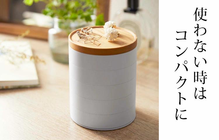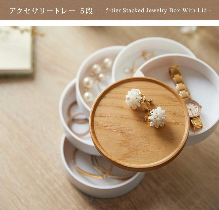 【蓋付きアクセサリートレー 5段】アクセサリーや小物類を収納するのに便利なトスカのアクセサリートレー5段。それぞれの段のトレーが360°回転するので向きを気にせずスライドさせて出し入れができます。また、木蓋は取り外し自由なのでアクセサリーの一時置きに便利◎トレー底面にはフェルトマットがついていて収納したアクセサリーが傷つくのを防止してくれます。